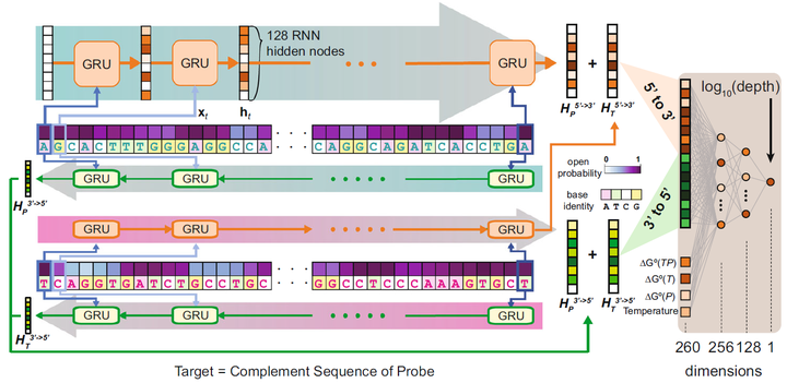 Targeted high-throughput DNA sequencing is a primary approach for genomics and molecular diagnostics, and more recently as a readout for DNA information storage. Oligonucleotide probes used to enrich gene loci of interest have different hybridization kinetics, resulting in non-uniform coverage that increases sequencing costs and decreases sequencing sensitivities. Here, we present a deep learning model (DLM) for predicting Next-Generation Sequencing (NGS) depth from DNA probe sequences. Our DLM includes a bidirectional recurrent neural network that takes as input both DNA nucleotide identities as well as the calculated probability of the nucleotide being unpaired. We apply our DLM to three different NGS panels: a 39,145-plex panel for human single nucleotide polymorphisms (SNP), a 2000-plex panel for human long non-coding RNA (lncRNA), and a 7373-plex panel targeting non-human sequences for DNA information storage. In cross-validation, our DLM predicts sequencing depth to within a factor of 3 with 93% accuracy for the SNP panel, and 99% accuracy for the non-human panel. In independent testing, the DLM predicts the lncRNA panel with 89% accuracy when trained on the SNP panel. The same model is also effective at predicting the measured single-plex kinetic rate constants of DNA hybridization and strand displacement.
